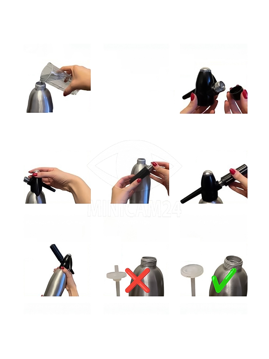 Бутылочный сифон для газирования воды предназначен для газирования воды и приготовления напитков и лимонадов. Превращает обычную воду в освежающие прохладительные напитки. Сифон очень прост в использовании. Для приготовления напитка или газировки необходимо заполнить емкость охлажденной питьевой водой (желательно перед эти охладить воду в холодильнике), установить в зарядный стержень баллон с газом, встряхнуть сифон, и через 10-15 секунд газированная вода или напиток готовы. Бутылочный сифон для газирования воды изготовлен из аллюминия, крышка сифона - из прочного качественного пластика. После приготовления газированной воды или напитков они могут храниться в сифоне до 2 суток. Для мытья сифона запрещается пользоваться посудомоечной машиной. К сифону подходят только баллончики на 8гр СО2 (размером 6,5 на 1,86)!